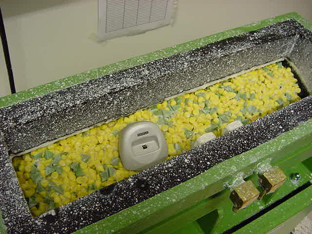 1、测试机器的槽中要装满磨损颗粒,颗粒要混合3份的 RKF 10K(黄色圆锥体)和1份的 RKK 15P(绿色的金字塔体),总共约15升。注意,新的磨损颗粒在使用前,需要在机器上泡至少2升的水中运行  6小时以上,并且运行过程中每半个小时添加0.5升的水。
